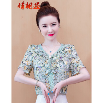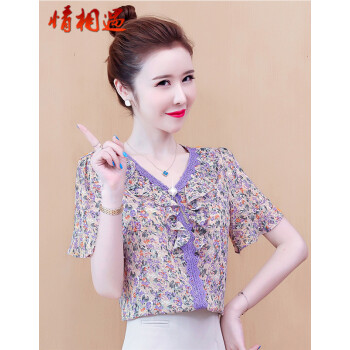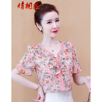情相遇 雪纺衫女短袖2020夏季新款韩版时尚V领荷叶边碎花百搭上衣宽松显瘦遮肚气质小衫 粉色 L |