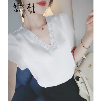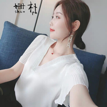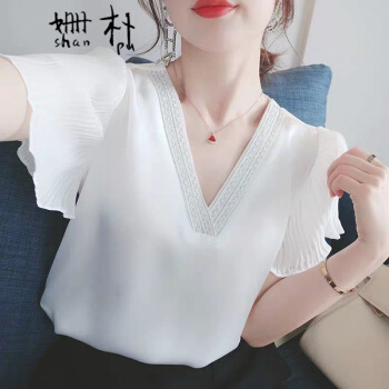 姗朴 雪纺衫女2020夏季新款大码女装印花雪纺洋气上衣宽松显瘦小衫短袖休闲时尚仙气V领港味荷叶袖衬衫 白色 L |