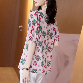 碎花雪纺衫女短袖夏季2020新款娃娃领衬衫洋气小衫法式泡泡袖时尚减龄气质衬衣潮 粉红色 L |
