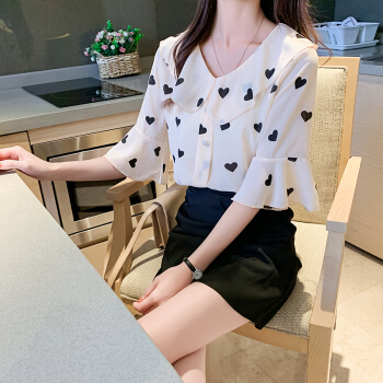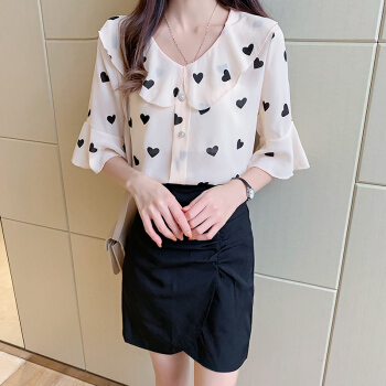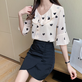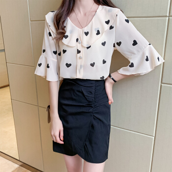 2020夏新款雪纺衫T恤女波点印花娃娃舒适透气领洋气荷叶边上衣胖妹妹女装 杏色 M |