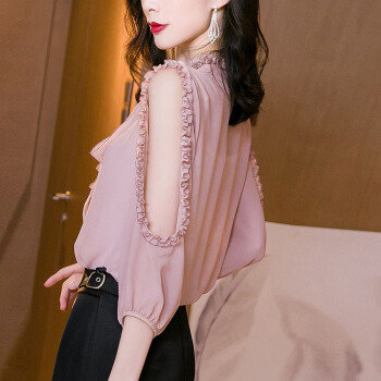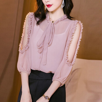 雪纺衬衫女装2020夏季新款韩版时尚系带洋气木耳边宽松百搭上衣设计感小众衬衣女 粉红色 L |