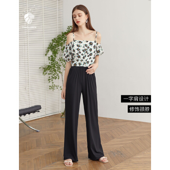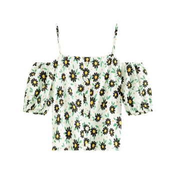 范思蓝恩 2020夏新款碎花雪纺衫短款一字肩上衣女短袖露肩吊带小衫 白底印花 XS |
