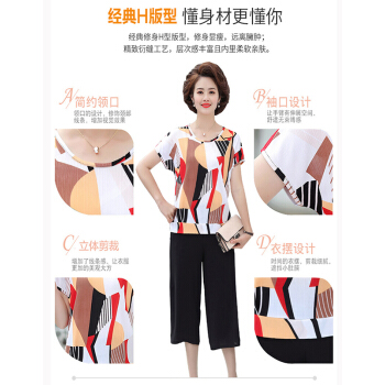 商茵SY妈妈装套装中老年女装2020年夏款短袖上衣+阔腿裤中年40岁50洋气时尚百搭高贵气质两件套 红色方块套装 2XL(建议105-120斤) |