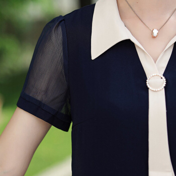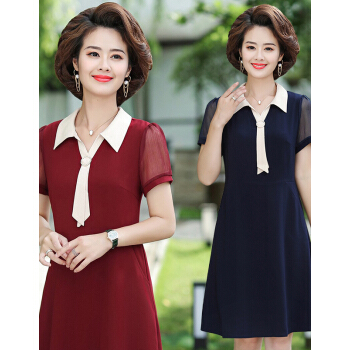 晳馥香中老年女装雪纺连衣裙女带领裙子夏季短袖翻领纯色40-50岁中年妈妈夏装 藏青 (请拍对应尺码) |
