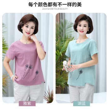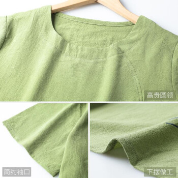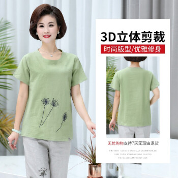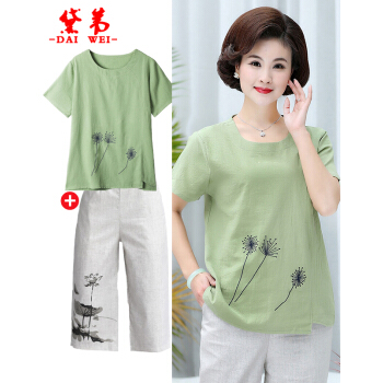 黛苇妈妈装夏装中老年女装休闲运动棉麻套装夏装洋气短袖女装上衣40岁50中年妈妈款时尚两件套大码女装 绿色 XL(90-110斤) |