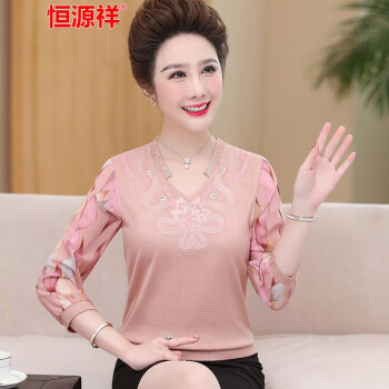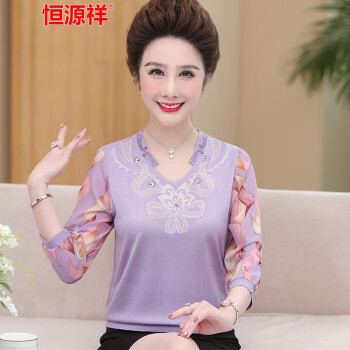 恒源祥中老年女装妈妈装长袖t恤女士针织2020秋季新款中年大码圆领纱袖上衣九分袖老年人奶奶装打底衫 7220浅紫 xL建议110--125斤 |
