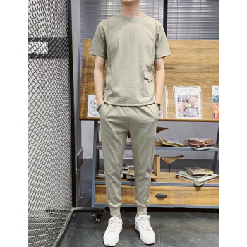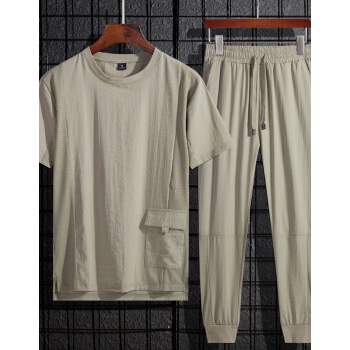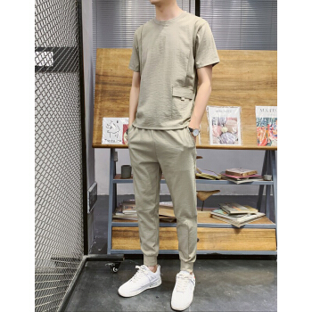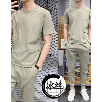 VACK 夏季韩版短袖套装男韩版衣服男情侣装夏装男装冰丝T恤套装潮牌夏天男士休闲套装男 卡其色 XL |