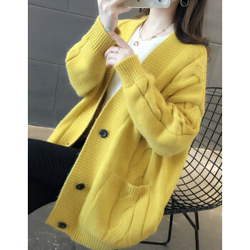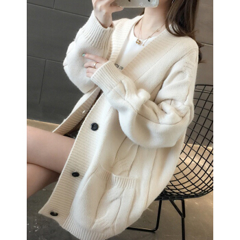 婪澈长袖针织衫女2020春秋新款女装韩版慵懒风V领中长款麻花针织衫宽松女开衫百搭毛衣外套 米白色 L |