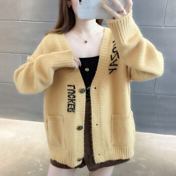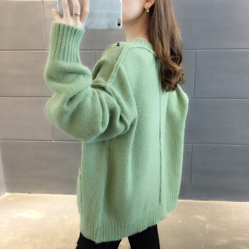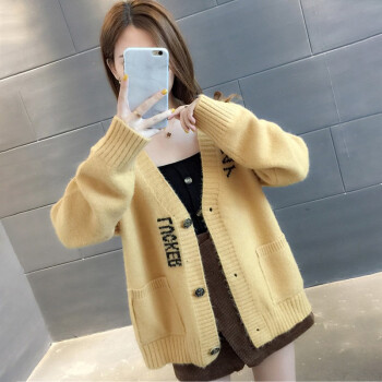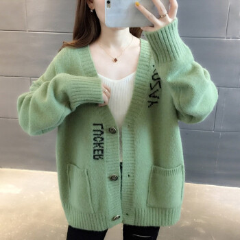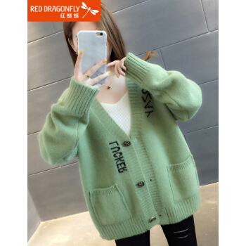 红蜻蜓 针织衫女2020秋装新款韩版V领字母口袋提花针织外套上衣宽松毛衣女开衫 WL727-2 绿色 均码 |