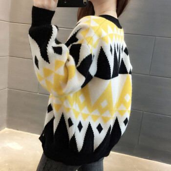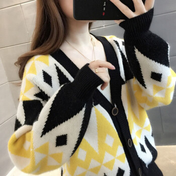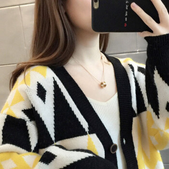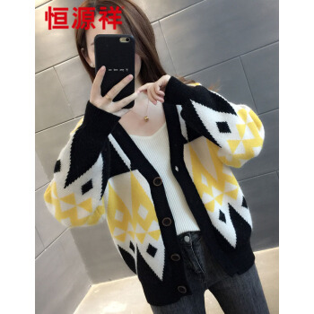 恒源祥针织衫女2020春秋季新款设计感小众短款菱格开衫毛衣女气质小香风长袖V领上衣女4644 黄色 M |