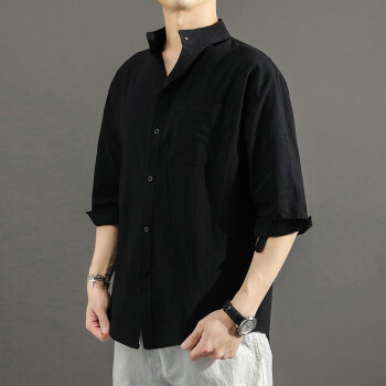 半双 短袖衬衫男2020夏季新款宽松大码中国风亚麻衬衣薄款男士休闲七分袖棉麻寸衫yym 黑色 M (建议100-115斤) |