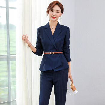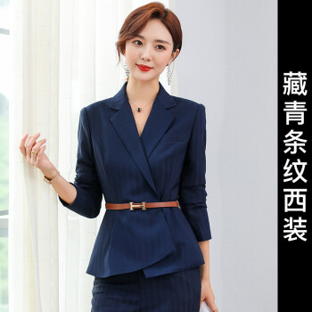 艾尚臣职业装女装套装女2020秋季新款高端商务总裁正装时尚OL条纹小西装女面试工装空姐气质工作服 藏青色条纹西装 S |