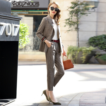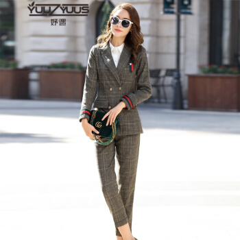 YUUZYUUS妤遇小西装女2020秋季新款韩版大牌时尚气质优雅格子裤子女职业装两件套套装女装 红线格子(两件套 配腰带、 ) M |