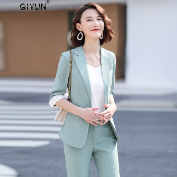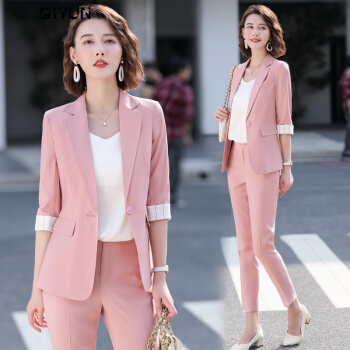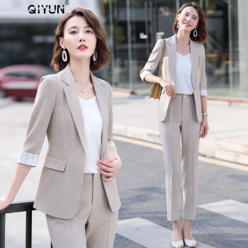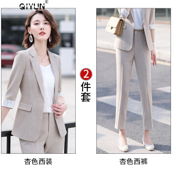 QIYUN轻奢品牌女装 小西装职业套装女2020夏季新款大码气质休闲时尚九分裤薄款显高显瘦西服外套 杏色西装+九分裤【需要短裤请备注】 M |