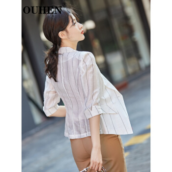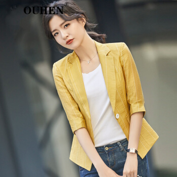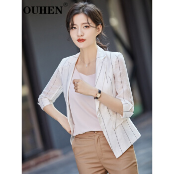 OUHEN高端品牌女装 亚麻小西装外套女2020新款夏薄款休闲小个子韩版条纹西服上衣 蓝色 M |