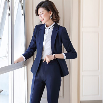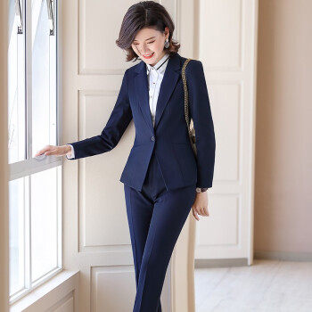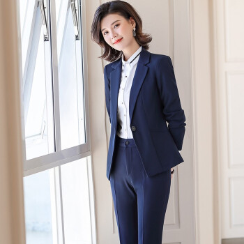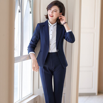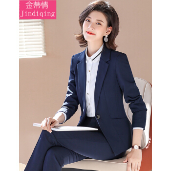 金蒂情 职业装女装套装女时尚气质修身西服女神范大学生面试正装酒店前台小西装工作服 蓝色西装+西裤 XL(建议110-120斤) |