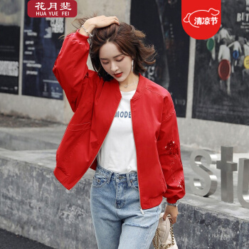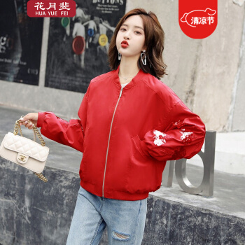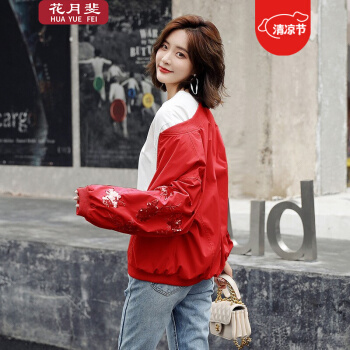 花月斐刺绣短外套女2020新款韩版宽松亮片棒球衫简约显瘦女士外套1992 红色 L |