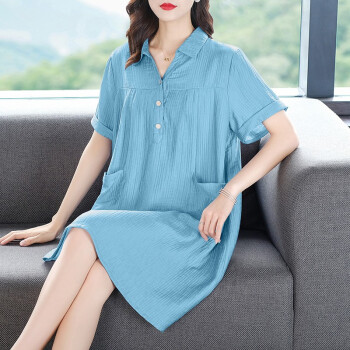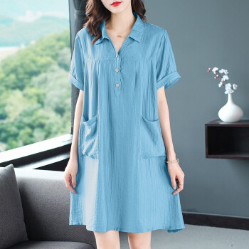 木棉林胖妹妹mm优雅连衣裙加大码女装2020新款夏装洋气减龄翻领宽松遮肚子中长款裙子女H202586 蓝色 XL建议120-140斤 |