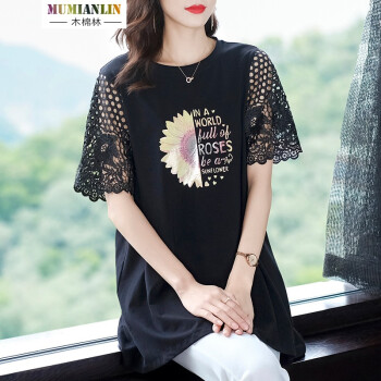 木棉林高端大码女装2020新款夏装胖妹妹mm减龄镂空拼接洋气印花中长款宽松显瘦T恤女L202797 黑色 2XL建议140-160斤 |
