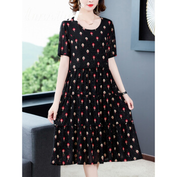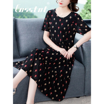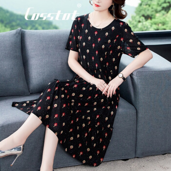 Cosstot轻奢品牌女装 大码高端连衣裙2020新款夏季中年妈妈贵夫人名媛气质遮肚裙子 黑色小树 XL |
