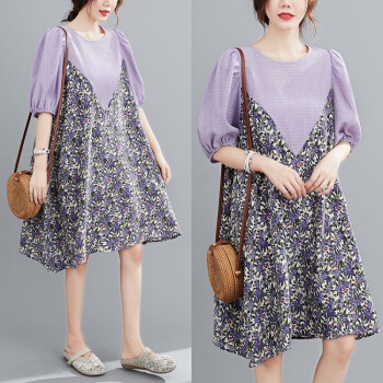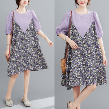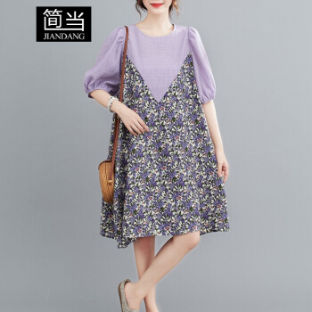 简当2020夏装新款加肥加大码女装胖妹妹MM碎花雪纺连衣裙法式裙宽松显瘦中长款A字裙SFF3456 紫碎花裙 均码( 100-190斤) |