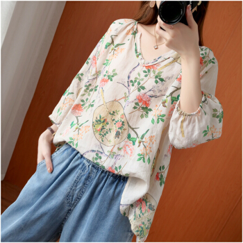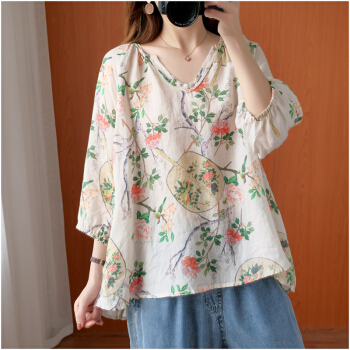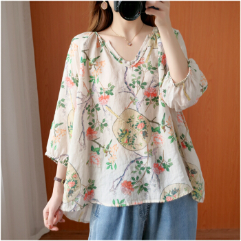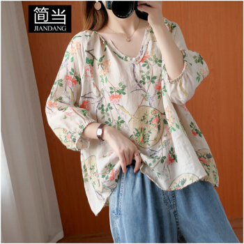 简当2020新款夏装加大码女装胖妹妹MM棉麻短袖宽松上衣单件上衣衬衫防晒衣T恤ZRK3061 花色 大码均码 |
