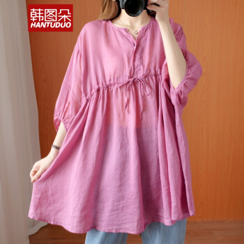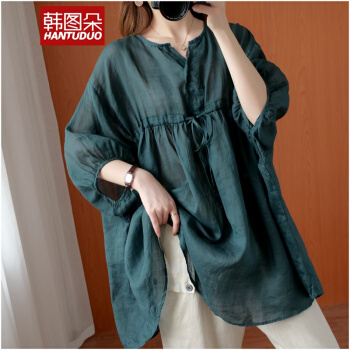 韩图朵胖妹妹mm大码衬衫女2020夏装新款棉麻衬衣短袖宽松上衣3068 墨绿色 大码均码 |