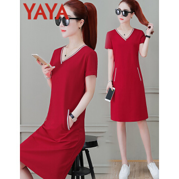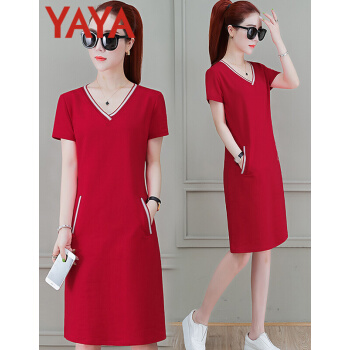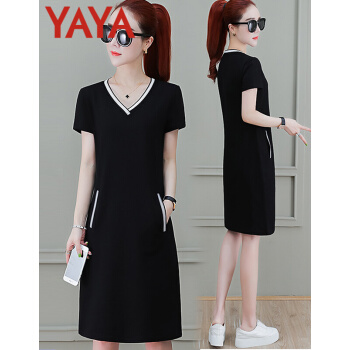 鸭鸭服饰(yaya)休闲运动连衣裙女中长款2020夏季新款宽松显瘦短袖V领T恤衬衫裙时尚女装裙子女 黑色 请选择正确尺码 |