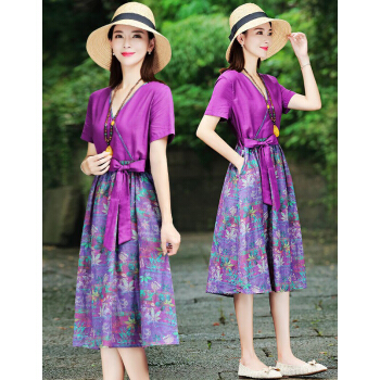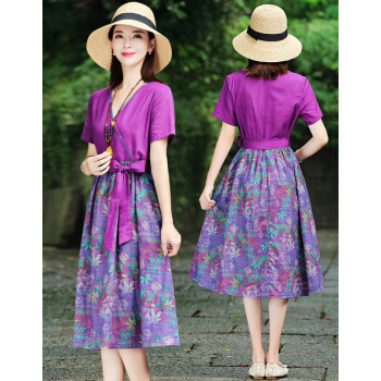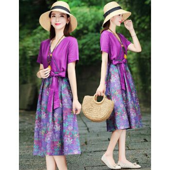苏洛琳雪纺连衣裙女2020夏季新款大码女装时尚气质女士棉麻中长印小个子碎花连衣裙蕾丝裙子女 图片色 M |