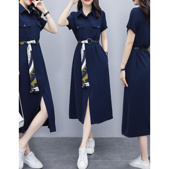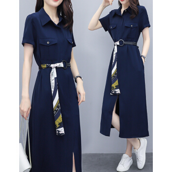 莱倪晟纳短袖连衣裙女装2020夏装新款韩版修身气质系带高腰显瘦开叉减龄中长裙潮 藏青色 请拍正确尺码 |