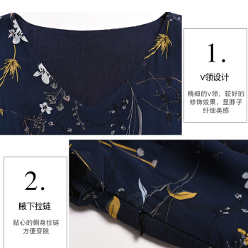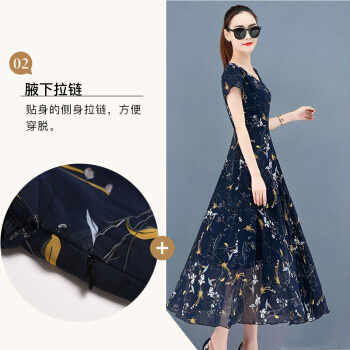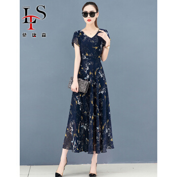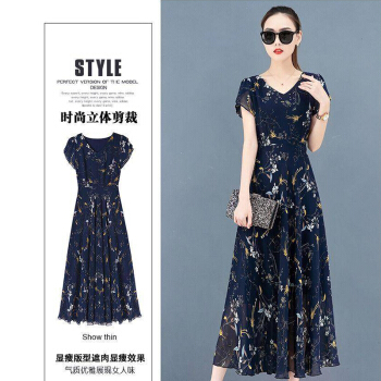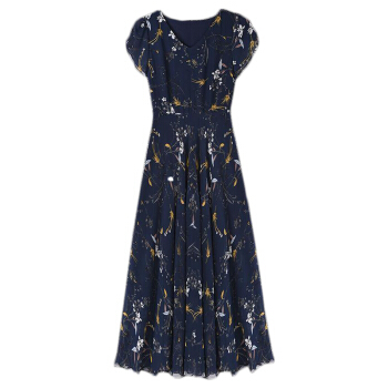 佬唐森印花雪纺连衣裙2020夏季新款碎花长裙大码女装遮肉显瘦减龄裙子 蓝底水仙花 请拍正确尺码 |