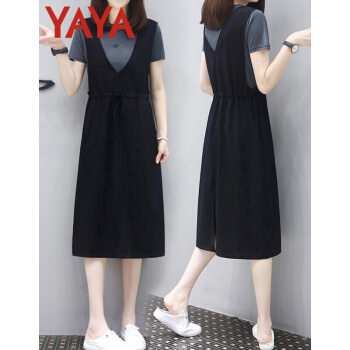 鸭鸭服饰(yaya)休闲连衣裙女2020年女装夏季新款流行韩版收腰显瘦两件套中长款T恤裙 灰T+黑裙 请选择正确尺码 |