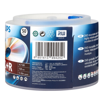 飞利浦(PHILIPS)DVD+R光盘/刻录盘 16速4.7G 手拎乖乖桶 桶装50片 |