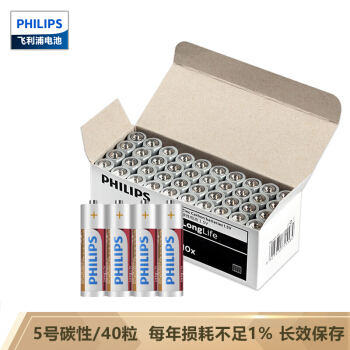飞利浦(PHILIPS)5号电池碳性电池40粒 适用于低功耗玩具/遥控器/闹钟/计算器等五号AA干电池 |