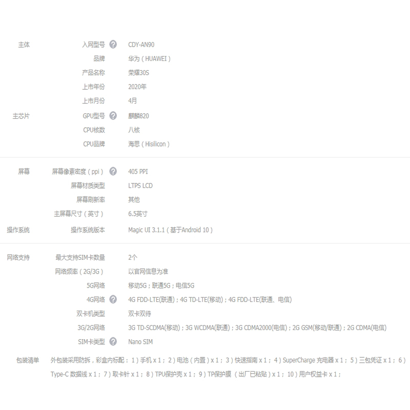 荣耀30S 双模5G 麒麟820 5G SOC芯片 8GB+128GB 幻夜黑【其他/幻夜黑】 |