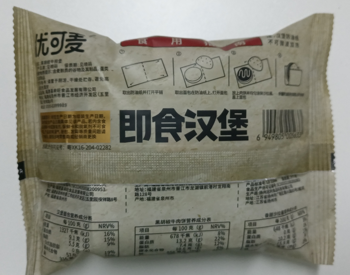 优可麦黑胡椒牛肉即食汉堡90g |