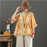 龙芝美 短袖衬衫女2020夏季新款棉麻女装文艺印花荷叶袖五分袖短款衬衣 L1-XJMC038-7133-黄色 L