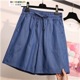 木棉林加肥加大码女装2020夏装新款冰丝五分大码牛仔短裤松紧腰薄宽松阔腿清凉胖MM热裤HYA47 蓝色 5XL(建议160-200斤)