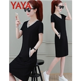 鸭鸭服饰(yaya)休闲运动连衣裙女中长款2020夏季新款宽松显瘦短袖V领T恤衬衫裙时尚女装裙子女 黑色 请选择正确尺码