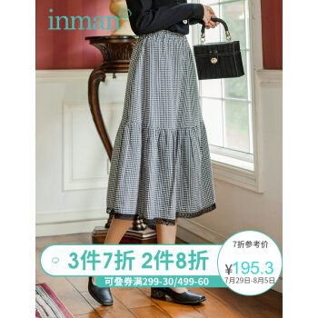茵曼2020秋装新款松紧高腰A字中长款学院花边文艺复古格子半身裙【F1803571】 黑格 L