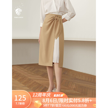 范思蓝恩 2020夏季新款不规则半身裙气质百褶裙女中长款高腰a字裙 驼色 M