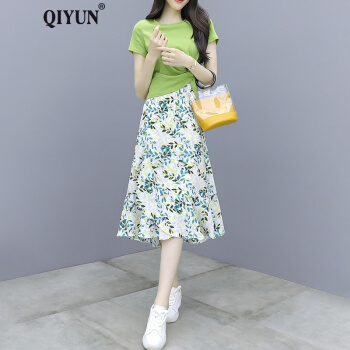 QIYUN品牌女装 时尚套装裙女小个子洋气减龄2020夏装新款女雪纺碎花半身裙两件套 翠绿色 M