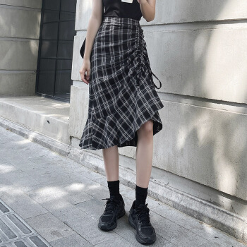 三裳高腰格子半身裙夏抽绳褶皱不规则a字裙显瘦一步包臀裙鱼尾裙中长 格子(棉麻) S