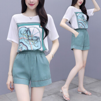 芙萝迪雅 2020新款洋气两件套宽松雪纺上衣配短裤女休闲时尚运动套装女夏 绿色 L