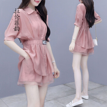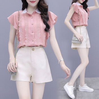 思语林 雪纺衫短裤套装女2020夏装新款小个子显高洋气减龄休闲短裤子两件套 粉色套装 S