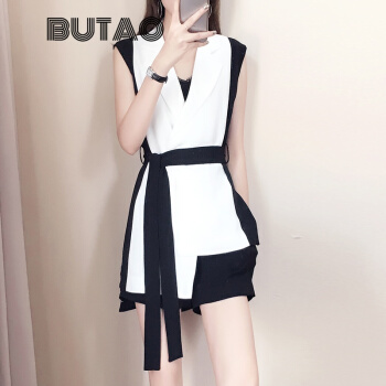 BUTAO 香港潮牌职业短裤套装女2020夏装新款女神范洋气时尚无袖小西装上衣名媛气质御姐两件套装女 白色+黑色【上衣+短裤】 M