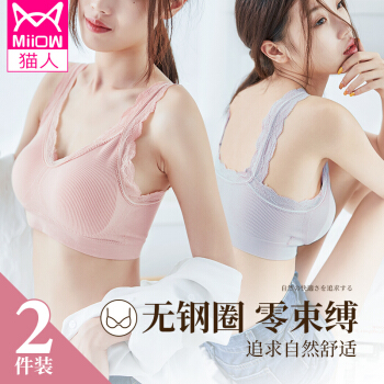 猫人2件装内衣女聚拢美背收副乳调整型胸罩女夏季薄款无钢圈跑步防震防走光睡眠运动文胸 冰灰色+水粉色