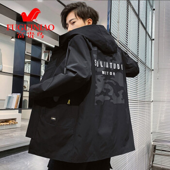 富贵鸟风衣男中长款外套2020春秋天青年时尚宽松连帽工装夹克男大码韩版加绒加厚潮流帅气时尚褂子上衣男 黑色薄款 XL(125-140斤)
