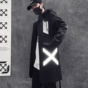 巴克龙秋冬新款连帽风衣男中长款韩版宽松港仔文艺男港风工装风衣青少年学生反光条外套加肥大码青年原创设计 黑色 M