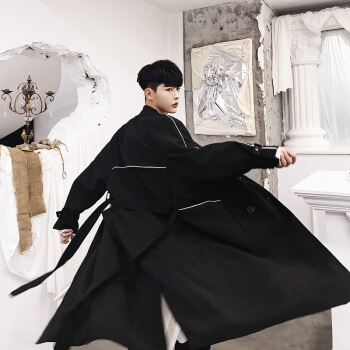 凯登狮(KEIDENLION)风衣男设计师加长款韩版男风衣宽松百搭系带外套A345-583 黑色 XL